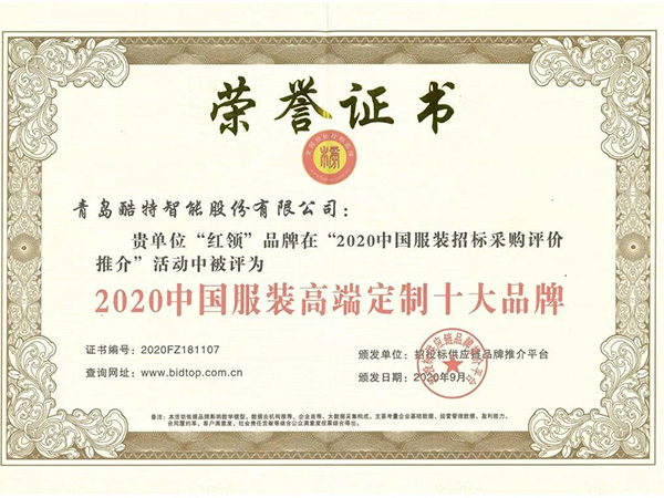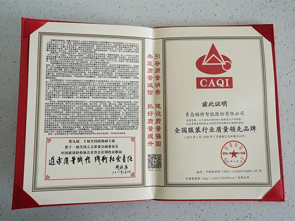 2020.10.21酷特智能榮獲全國服裝行業(yè)質(zhì)量領(lǐng)先品牌、全國百佳質(zhì)量檢驗誠信標(biāo)桿企業(yè)、全國質(zhì)量檢驗穩(wěn)定合格產(chǎn)品三項殊榮。