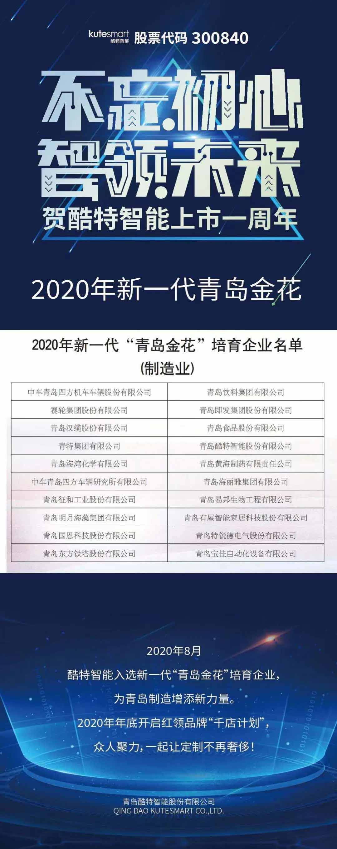 2020年8月,青島市工信局、市發(fā)改委、市農(nóng)業(yè)農(nóng)村局聯(lián)合發(fā)布了《2020年新一代“青島金花”培育企業(yè)名單》,其中,酷特智能作為中國產(chǎn)業(yè)互聯(lián)網(wǎng)時代上市企業(yè)躋身榜中,為青島制造增添新的力量。