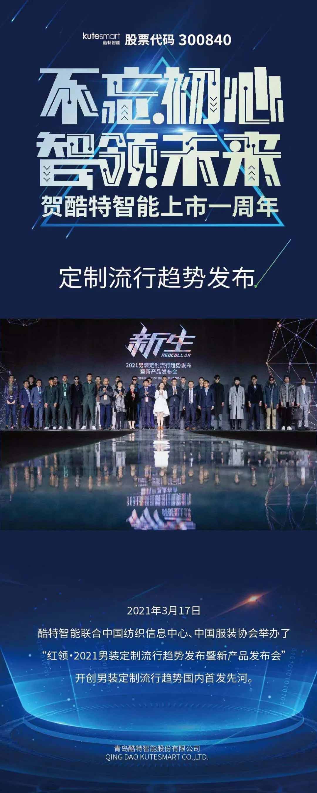 今天,是酷特智能上市一周年之日,回首過去一年時光,我們開拓創(chuàng)新,砥礪奮進,始終堅持“成為有益于社會文明進步的百年企業(yè)”的使命,堅守“誠信、品質、創(chuàng)新、服務”的經(jīng)營理念,面對上市后的新形勢和新挑戰(zhàn),酷特智能全面開啟以C2M產(chǎn)業(yè)互聯(lián)網(wǎng)生態(tài)為核心的新十年戰(zhàn)略,將用十年時間,向產(chǎn)業(yè)互聯(lián)網(wǎng)發(fā)起2.0版攻勢,全面呈現(xiàn)制造業(yè)未來的新形態(tài)。