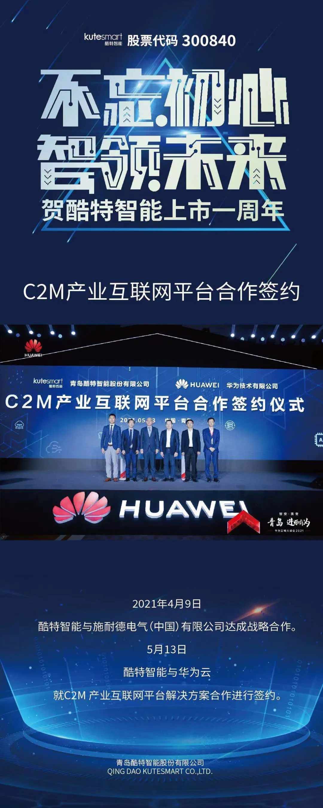 2021年5月13日,酷特智能與華為云就C2M產(chǎn)業(yè)互聯(lián)網(wǎng)平臺解決方案合作進行簽約。雙方將共同打造國內(nèi)一流的C2M產(chǎn)業(yè)互聯(lián)網(wǎng)平臺解決方案,聯(lián)合拓展智能制造市場與大企業(yè)云服務市場,為政府客戶和大企業(yè)客戶提供一站式解決方案??崽刂悄芎腿A為云的強強聯(lián)合為C2M產(chǎn)業(yè)互聯(lián)網(wǎng)發(fā)展注入新力量,推動傳統(tǒng)制造業(yè)實現(xiàn)跨越式發(fā)展,助力打造青島“世界工業(yè)互聯(lián)網(wǎng)之都”。