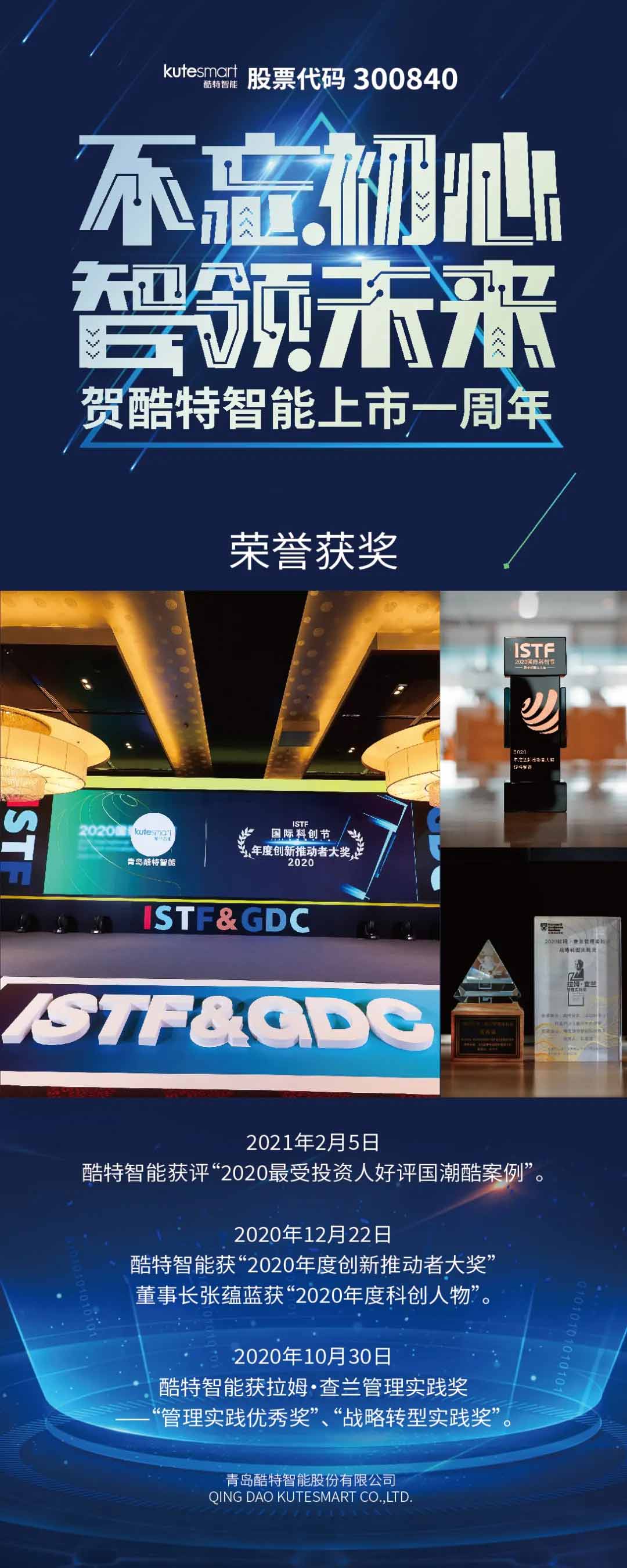 2021年2月5日,中國領先記者工作平臺鯨平臺,聯(lián)合國際數(shù)字商業(yè)創(chuàng)新大獎ECI在線上舉行了“2021鯨潮論壇暨首屆鯨潮獎榜單發(fā)布儀式”。其中,酷特智能獲評“2020最受投資人好評國潮酷案例”。