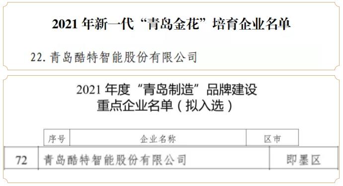 近日,由青島市工業(yè)和信息化局、市發(fā)展改革委、市農(nóng)業(yè)農(nóng)村局聯(lián)合組織開展的2021年新一代“青島金花”培育企業(yè)公開遴選工作已完成,公布名單顯示,包括酷特智能在內(nèi)的共66家企業(yè)入選。同時,由市工業(yè)和信息化局組織的2021年度“青島制造”品牌建設(shè)重點(diǎn)企業(yè)公開遴選工作也于近日公布擬入選名單,酷特智能位列其中。