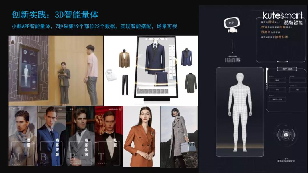 “我們自主研發(fā)了專利量體工具和量體方法——小酷APP定制交互系統(tǒng)實(shí)現(xiàn)AI智能量體,可克服傳統(tǒng)服裝定制模式中老裁縫打版、量體的時(shí)間周期長(zhǎng)、效率低的缺陷。”張?zhí)N藍(lán)透露。在實(shí)際操作中,當(dāng)客戶不方便現(xiàn)場(chǎng)量體時(shí),就可以通過“紅領(lǐng)REDCOLLAR”微信小程序中的“易拍量體”功能,只需拍攝一張正面照和一張側(cè)面照,再將2張照片上傳至系統(tǒng),即可解鎖人體密碼,獲取全身19個(gè)部位的22個(gè)身體數(shù)據(jù),輕松實(shí)現(xiàn)自主量體下單,重塑了購(gòu)物模式。