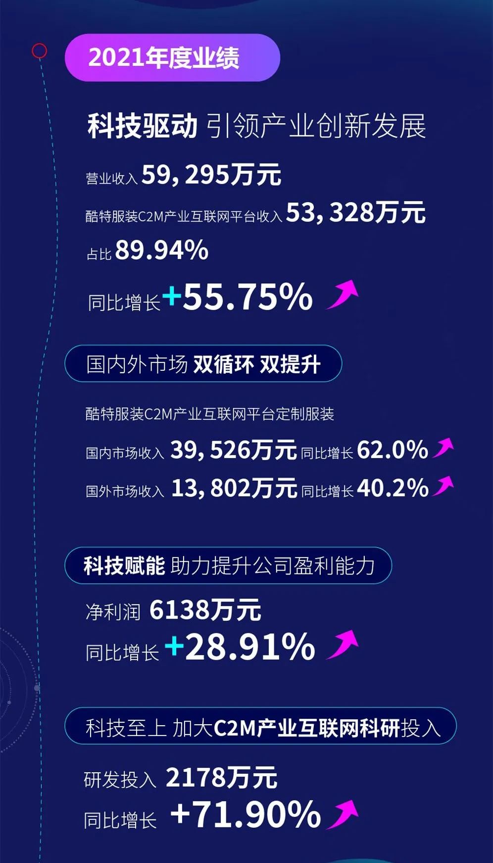 2022年4月26日,酷特智能發(fā)布2021年年度報(bào)告。報(bào)告顯示,2021年酷特智能實(shí)現(xiàn)營(yíng)業(yè)收入59295萬(wàn)元,其中酷特服裝C2M產(chǎn)業(yè)互聯(lián)網(wǎng)業(yè)務(wù)收入53328萬(wàn)元,占比89.94%,較2020年同期大幅增長(zhǎng)55.75%;公司實(shí)現(xiàn)凈利潤(rùn)6138萬(wàn)元,較2020年同期增長(zhǎng)28.91%,其中定制服裝利潤(rùn)顯著提升。