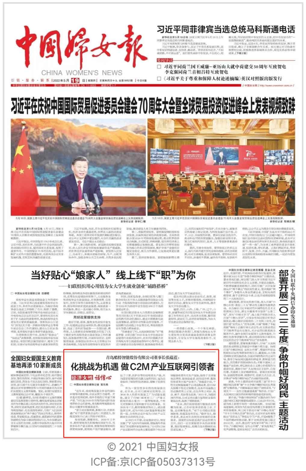 5月19日,《中國婦女報》于頭版刊登文章“化挑戰(zhàn)為機遇,做C2M產(chǎn)業(yè)互聯(lián)網(wǎng)引領(lǐng)者”,對酷特智能董事長張?zhí)N藍進行了專訪。著眼于疫情之下,張?zhí)N藍是如何帶領(lǐng)酷特智能突出重圍,實現(xiàn)高質(zhì)量發(fā)展的。以下為文章內(nèi)容: