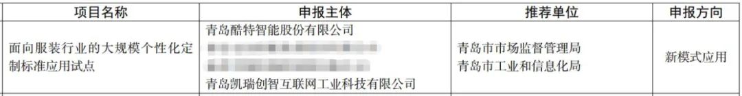 近日,國(guó)家市場(chǎng)監(jiān)管總局、工業(yè)和信息化部聯(lián)合發(fā)布《關(guān)于2022年度智能制造標(biāo)準(zhǔn)應(yīng)用試點(diǎn)項(xiàng)目名單的公示》,其中,酷特智能與子公司凱瑞創(chuàng)智聯(lián)合申報(bào)的“面向服裝行業(yè)的大規(guī)模個(gè)性化定制標(biāo)準(zhǔn)應(yīng)用試點(diǎn)”成功入選。