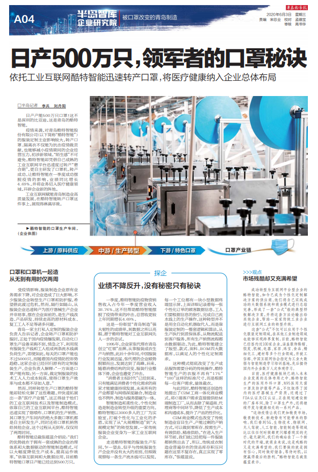6月3日,半島新聞特別策劃“被口罩改變的青島制造”系列報道,第一篇便探秘了青島的“口罩狂人”——酷特智能。依托工業(yè)互聯(lián)網(wǎng),酷特智能迅速轉(zhuǎn)產(chǎn)口罩,將醫(yī)療健康納入企業(yè)總體布局,日產(chǎn)500萬只,領(lǐng)軍者的口罩秘訣是什么?請看報道詳情: